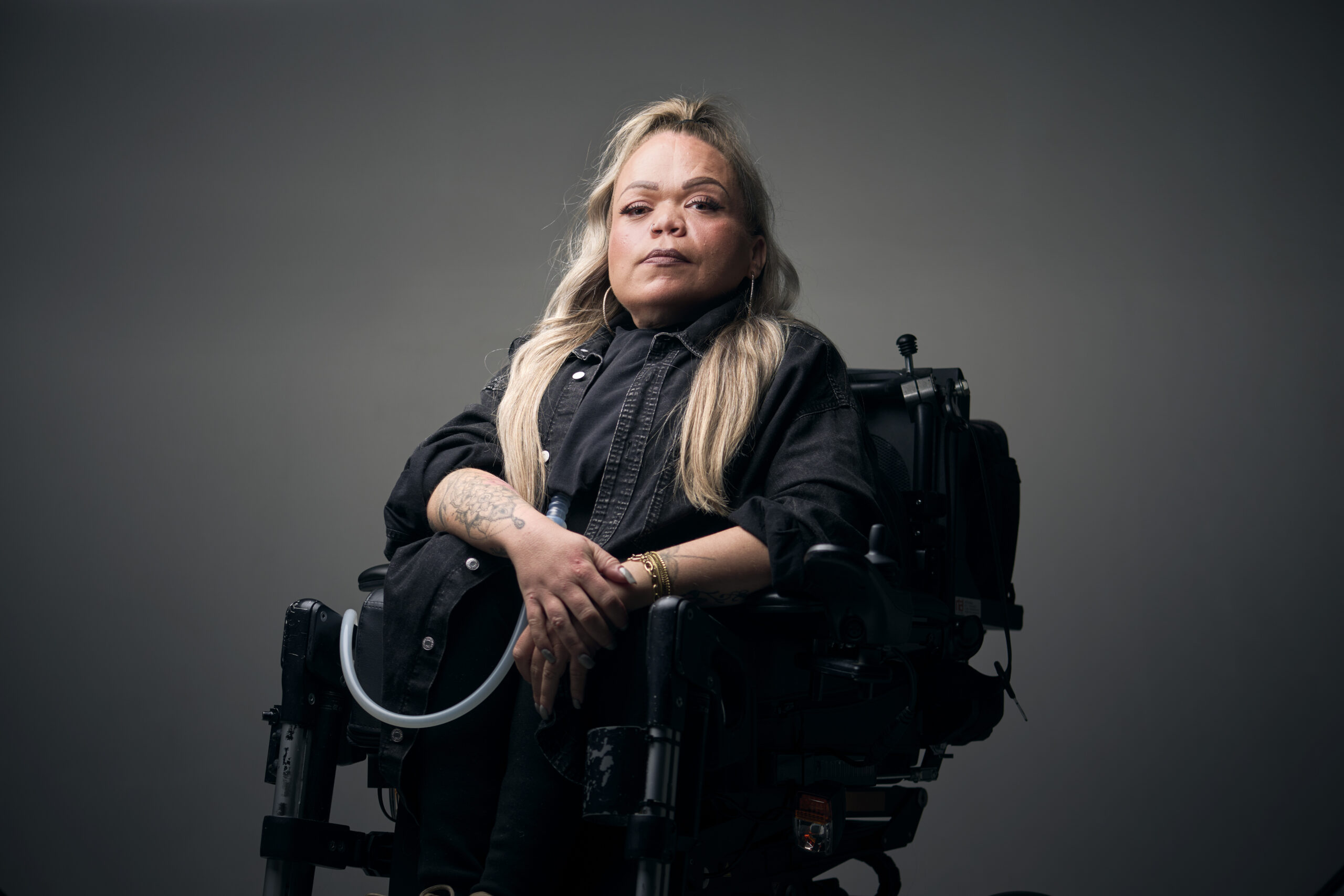 Britt-Marie, een meisje met een verstandelijke beperking, die haar arm in haar zij heeft en zelfverzekerd naar je kijkt